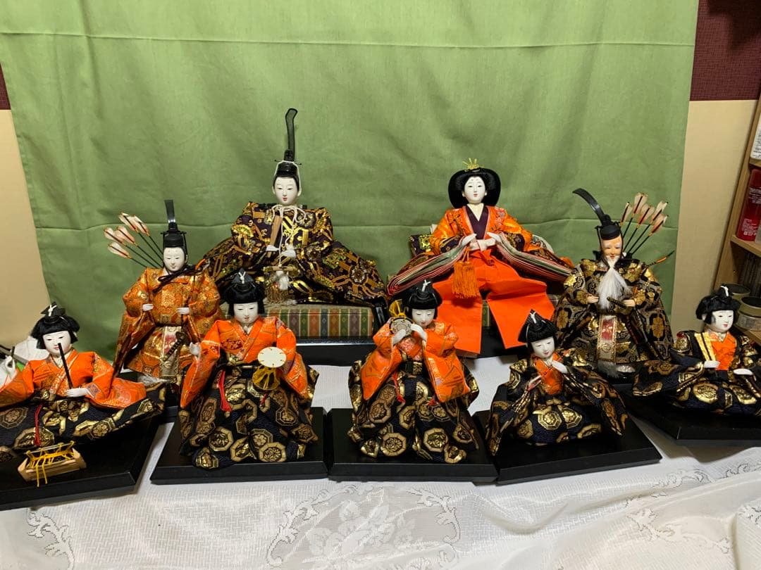 きめこみ 加茂雛 \r親王飾り(男雛、女雛)\r親王台 \r燭台・貝桶 1対\r\r玉秀作 471 紫野\r\rサイズ\rお内裏様 約19㎝ x 15㎝ x 16㎝\rお雛様 約19cm x 17㎝ x 12㎝\r親王台 底 約26cm x 22cm(布の部分 約23㎝ x 19㎝)x 約3.5㎝\r燭台 約24㎝\r貝桶 約17.5㎝ 対角の長さ 約6㎝\r\r画像に映っている親王台が載っている飾り黒台(75cmx45cm)は商品に含まれません。\r\r優しいお顔に惹かれ、40年ほど前に購入しました。\rここ数年飾ってあげることが出来なくなり、どなたか代わりに飾っていただける方がいらっしゃいましたらと思い、出品いたしました。\r親王台と男雛女雛だけを食器棚の中に飾っても素敵でした。\r\r貝桶とは、 「貝合わせ」に使う貝を収納する容器。二枚の貝がぴったりと合うことから夫婦円満の象徴とされ、江戸時代には大名の婚礼道具として重要視されていたそうです。\r\r人形には目立った汚れ、傷等はないと思います。\rただし、親王台には一部黄ばみが見られます。\r\r中古であることをご理解いただけるかたのご購入をお願いいたします。\r完璧を求められる方はご遠慮ください。\r\r注1)佐川急便/日本郵便での発送を考えていますが、他のメルカリ便に変更する場合もあります点、ご了承ください。\r注2)気持ち良い取引を行うため、プロフィールをご覧いただきたく、よろしくお願いいたします\r注3)お値下げ要望はコメントよりお願いいたします。\r\r種類...雛人形・お雛様・ひな人形 木目込み人形\r特徴...親王飾り(男雛・女雛のみ)| カテゴリー: | キッチン・日用品・その他>>>季節・年中行事>>>雛人形・ひな祭り |